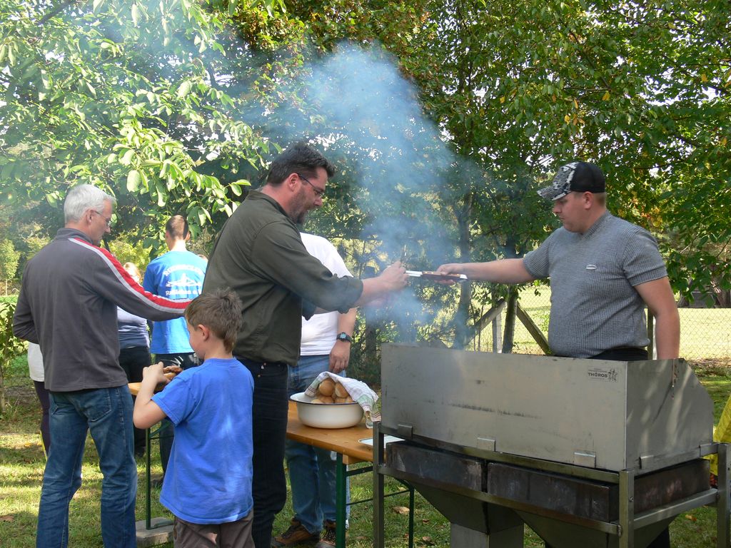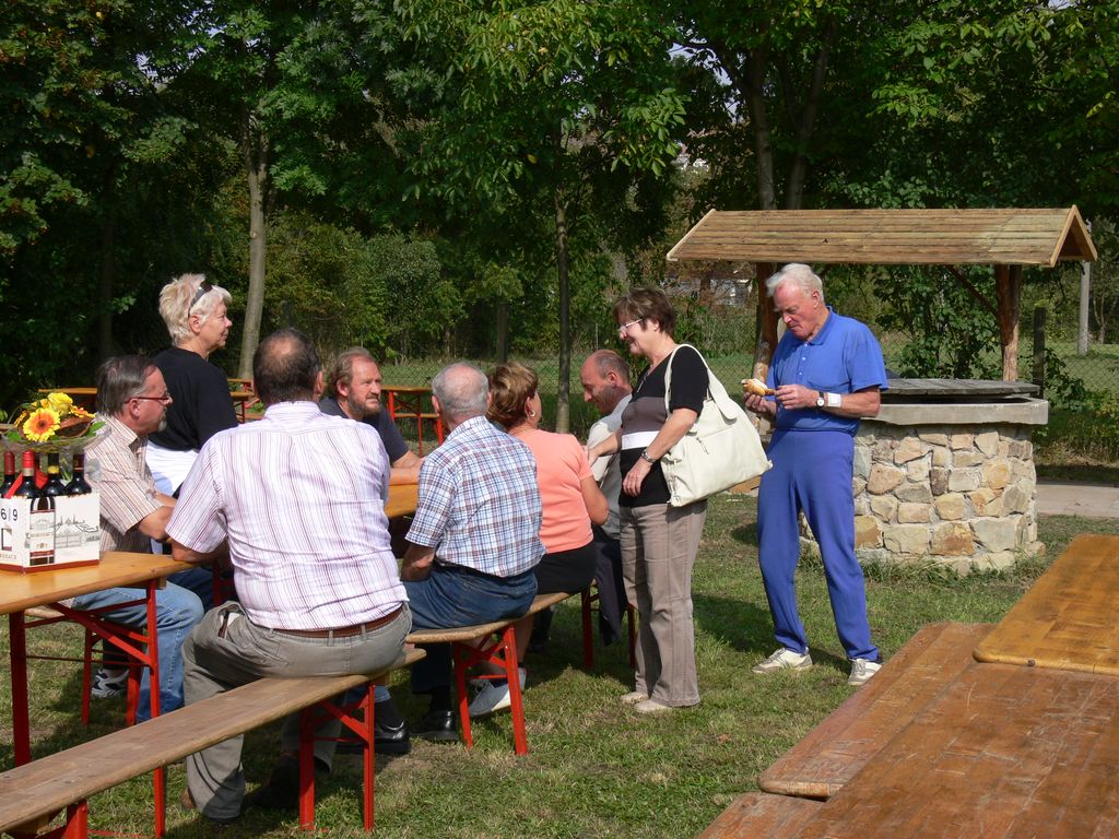 Man saß bei dem herrlichen Wetter noch lange gemütlich beisammen und tauschte Erinnerungen aus. Das wurde dann abends noch im Klubraum des Ruderzentrums fortgesetzt. Interessant war die Reaktion auf die Bilderfolge aus 50 Jahren Ruderclub Roßleben, immerhin waren auch einige Ehemalige der Anfangsjahre anwesend, die beim Bau der Bootshalle im Klosterpark mitgewirkt hatten. Damals wurden buchstäblich Berge mit Hacke, Schaufel und Schubkarre versetzt, denn einen Bagger hatte man noch nicht zur Verfügung.