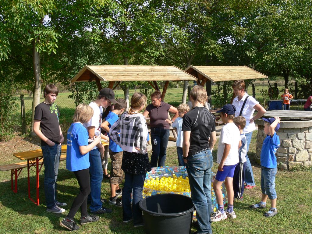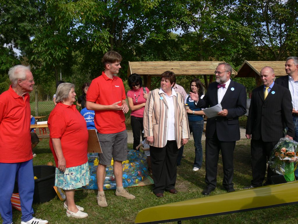 Nachmittags war dann richtige Volksfeststimmung auf der Wiese neben der Bootshalle. Hanno Richter, als stellvertretender Vorsitzender und Karl Träger, als Vorsitzender begrüßten alle Anwesenden. Er bedankte sich bei den Mitgliedern und Helfern, die diese Veranstaltung vorbereitet haben und bei der Durchführung der Veranstaltung zur Verfügung stehen. Dann erinnerte er noch einmal an die schweren Anfangsjahre und bedankte sich bei den ehemaligen Mitgliedern für ihre Aufbauarbeit. In den 50 Jahren haben zahlreiche Mitglieder einen mehr oder weniger großen Anteil zur Schaffung des derzeitigen Ruderzentrums geleistet. Es gab viele Höhen und Tiefen und viele „Steine“ mussten aus dem Weg geräumt werden. Für die jetzigen Mitglieder gibt es aber noch genug zu tun, denn immerhin ist es eine Verpflichtung die Trainingsstätte mit minimalen Kosten instand zu halten. Daher sind die 1.200,00 € Lottomittel eine große Hilfe bei der Sanierung der Sanitäranlagen. Auch die Spenden einiger Gäste helfen weiter.