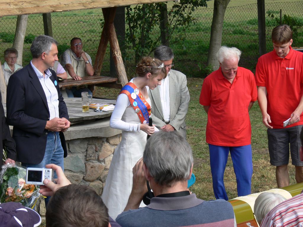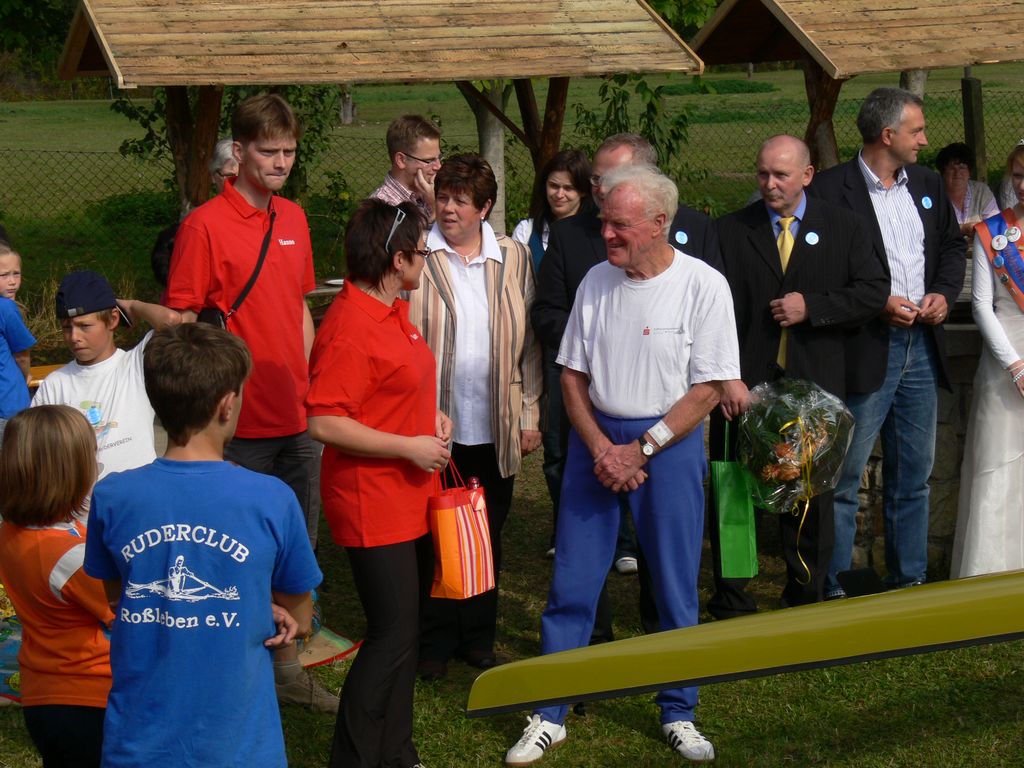 Karl Träger, seit 50 Jahren Vereinsvorsitzender erhielt aus den Händen vom Vorsitzenden der Kyffhäuserkreissportbundes, Andreas Räuber, und Landrat, Herrn Peter Hengstermann, als erster im Bereich es Sports die Verdienstmedaille des Kyffhäuserkreises. Die Taufe eines Renneiners durch die Unstrutnixe und das Enterennen rundeten die Festlichkeiten ab und bereiteten vor allem den Kindern viel Spaß. Die Frauengruppe und Eltern der Ruderkinder hatten für ein leckeres Kuchenbüffet gesorgt. Es fand bei den Gästen regen Zuspruch.