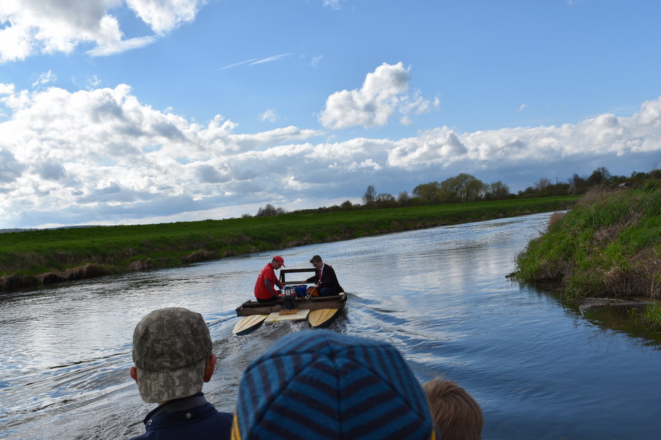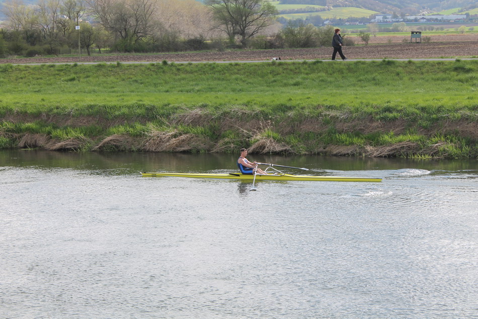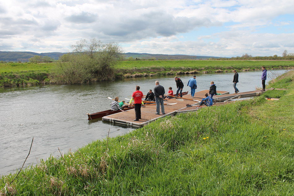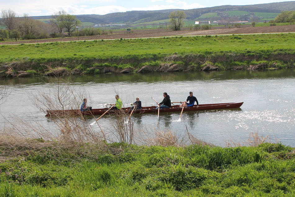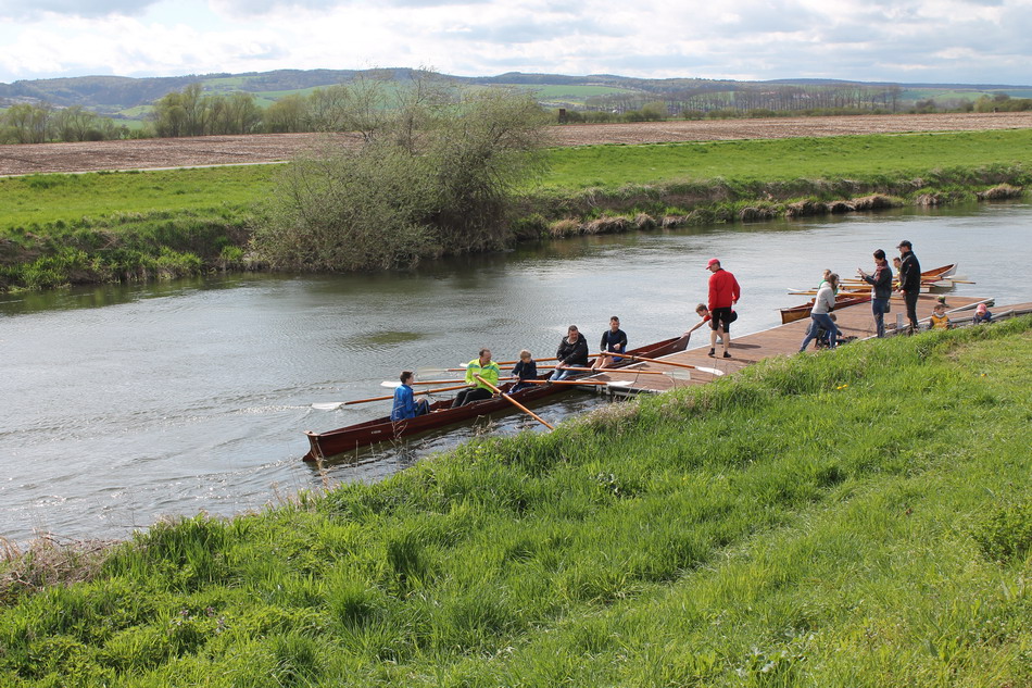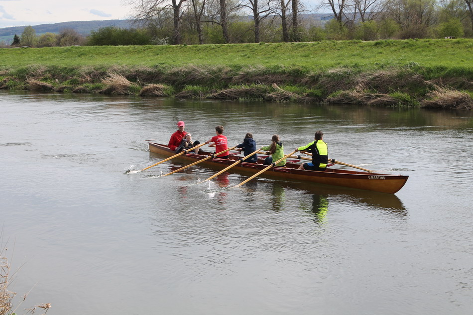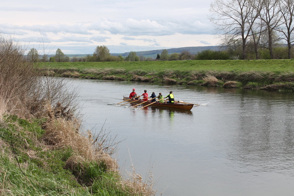 Mit vereinten Kräften wurde der lange, schlanke Vierer, der den Namen „Jena“ am Heck trägt, als Erstes zur Anlegestelle getragen und vorsichtig zu Wasser gelassen. Die Sitze aus glatt poliertem Holz waren schnell eingebaut und die Ruder in die Halterungen gesteckt. Dann stiegen Matthias Mundin, Lukas Klebs, Tom Hesse und Ulf Schütz-Heinrich ins Boot, und Kersten und Arved Heinrich übernahmen den Platz der Steuerleute. Abgelegt – und sofort trieb die starke Strömung das Boot in Richtung Unstrutbrücke. Auf dem Rückweg musste der Vierer sich dann ordentlich ins Zeug legen, um gegen Wind und Fluss anzukommen.